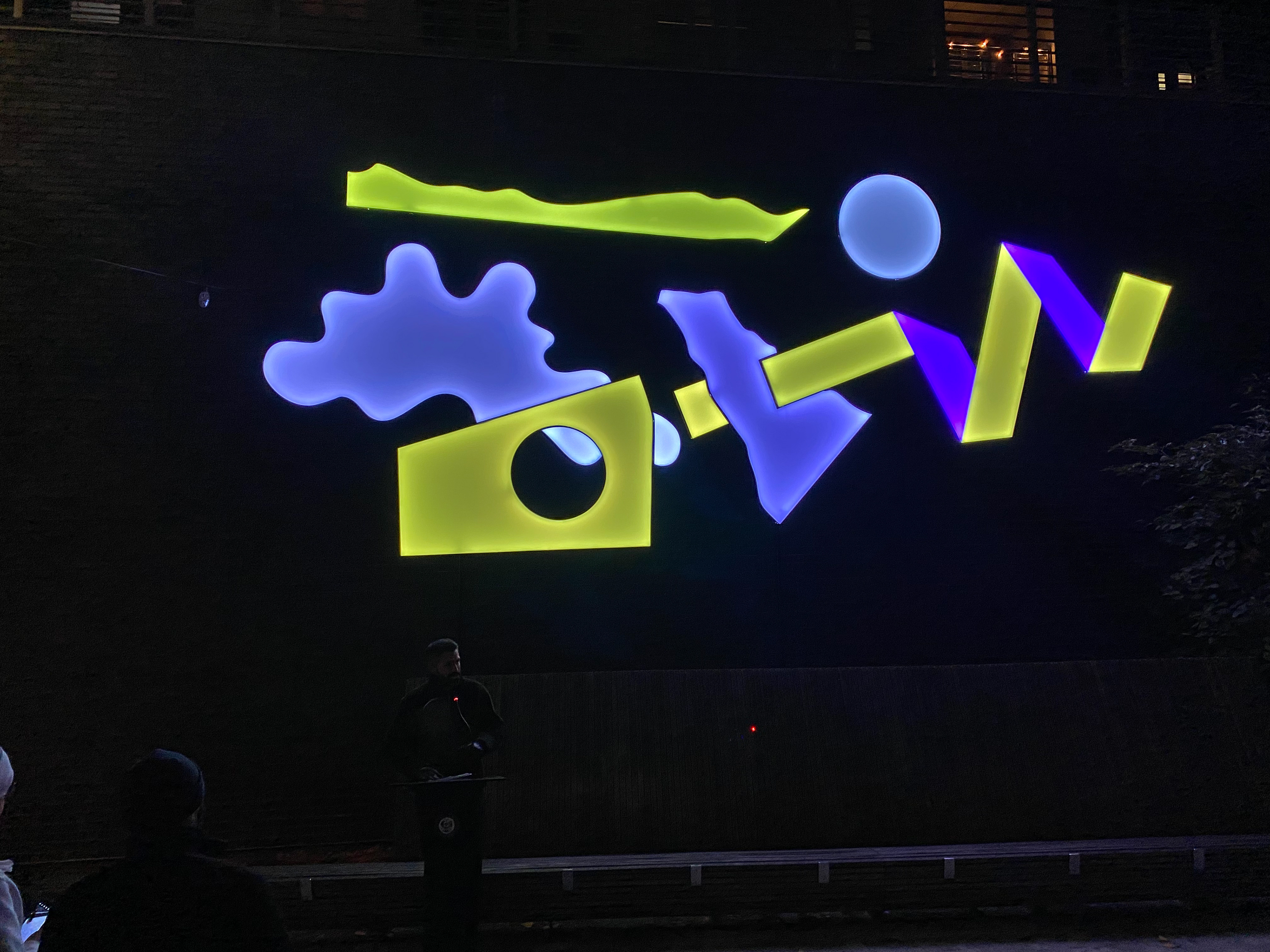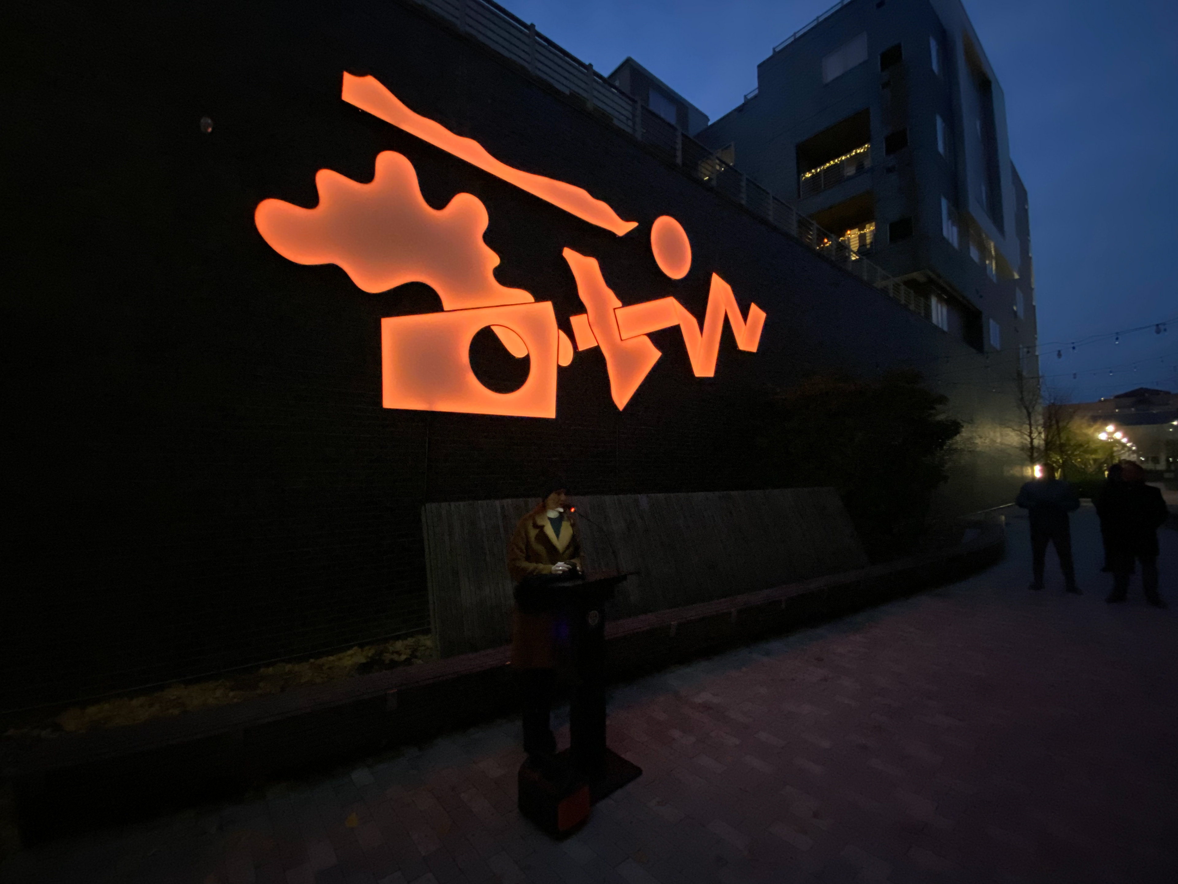 Media: Channel Lettering (aluminum, Acrylic and LEDs), User interface, Speakers. Location: Arts Alley, Allentown Pennsylvania