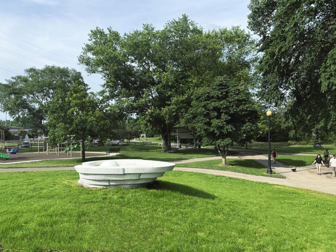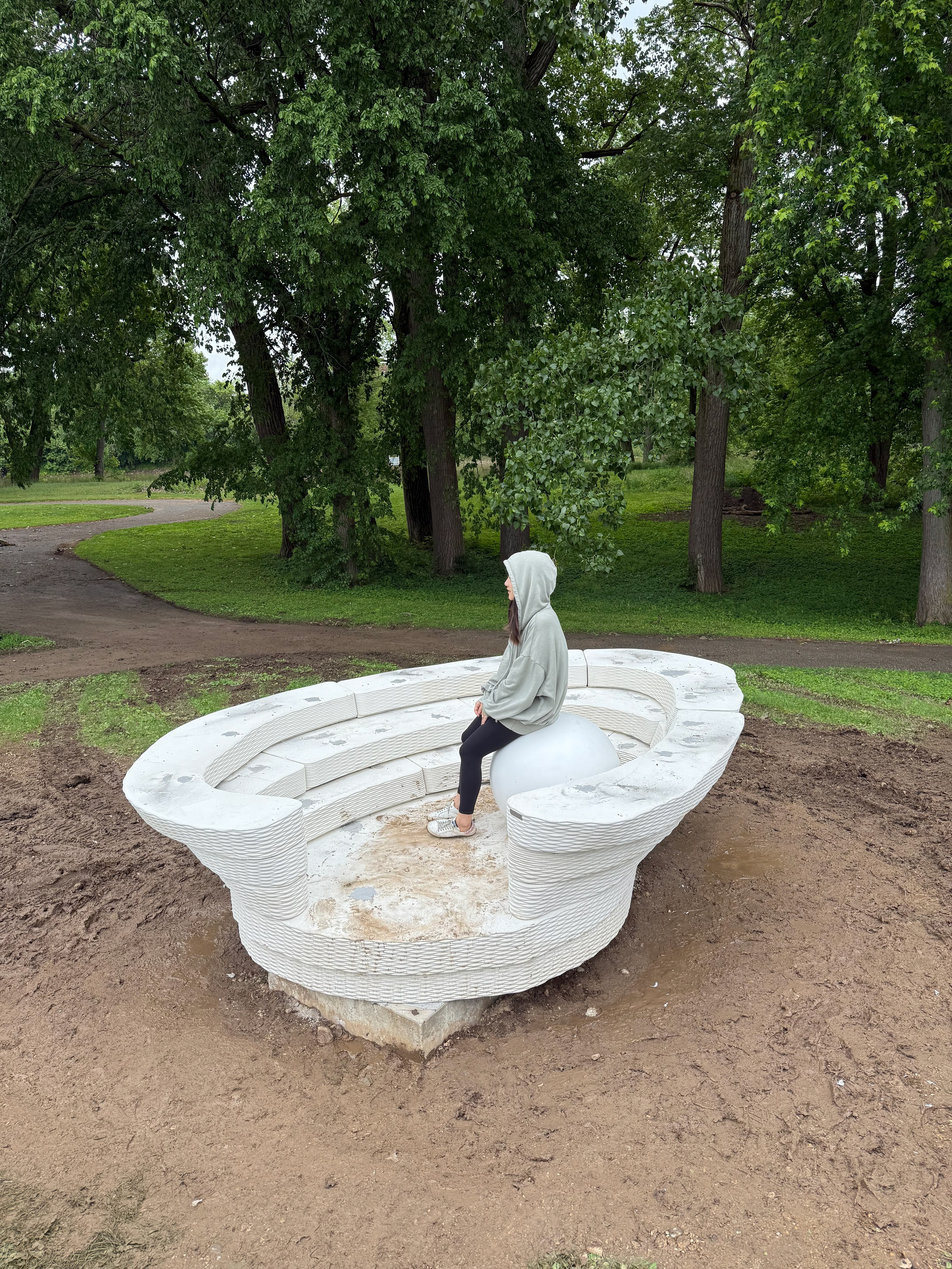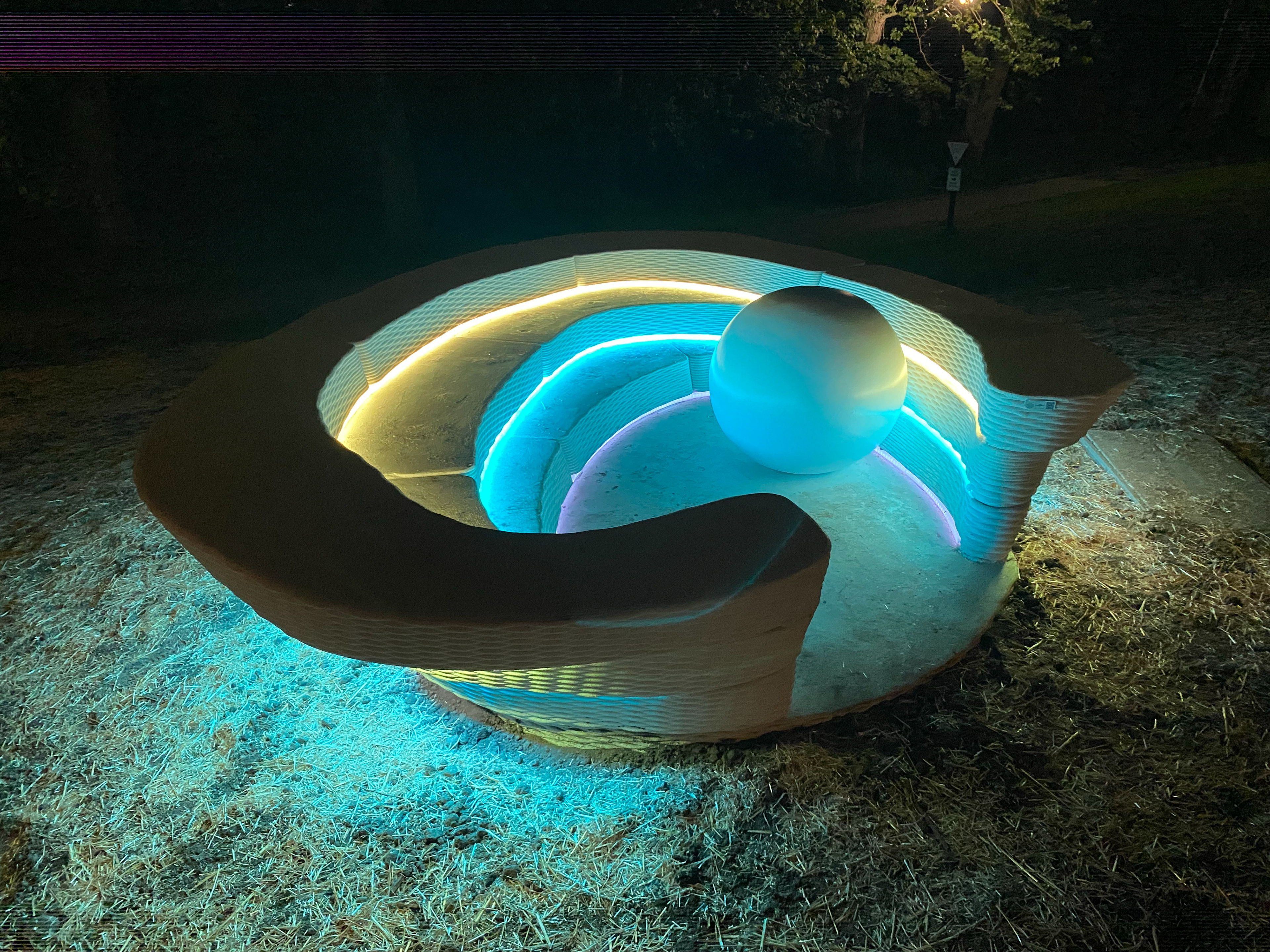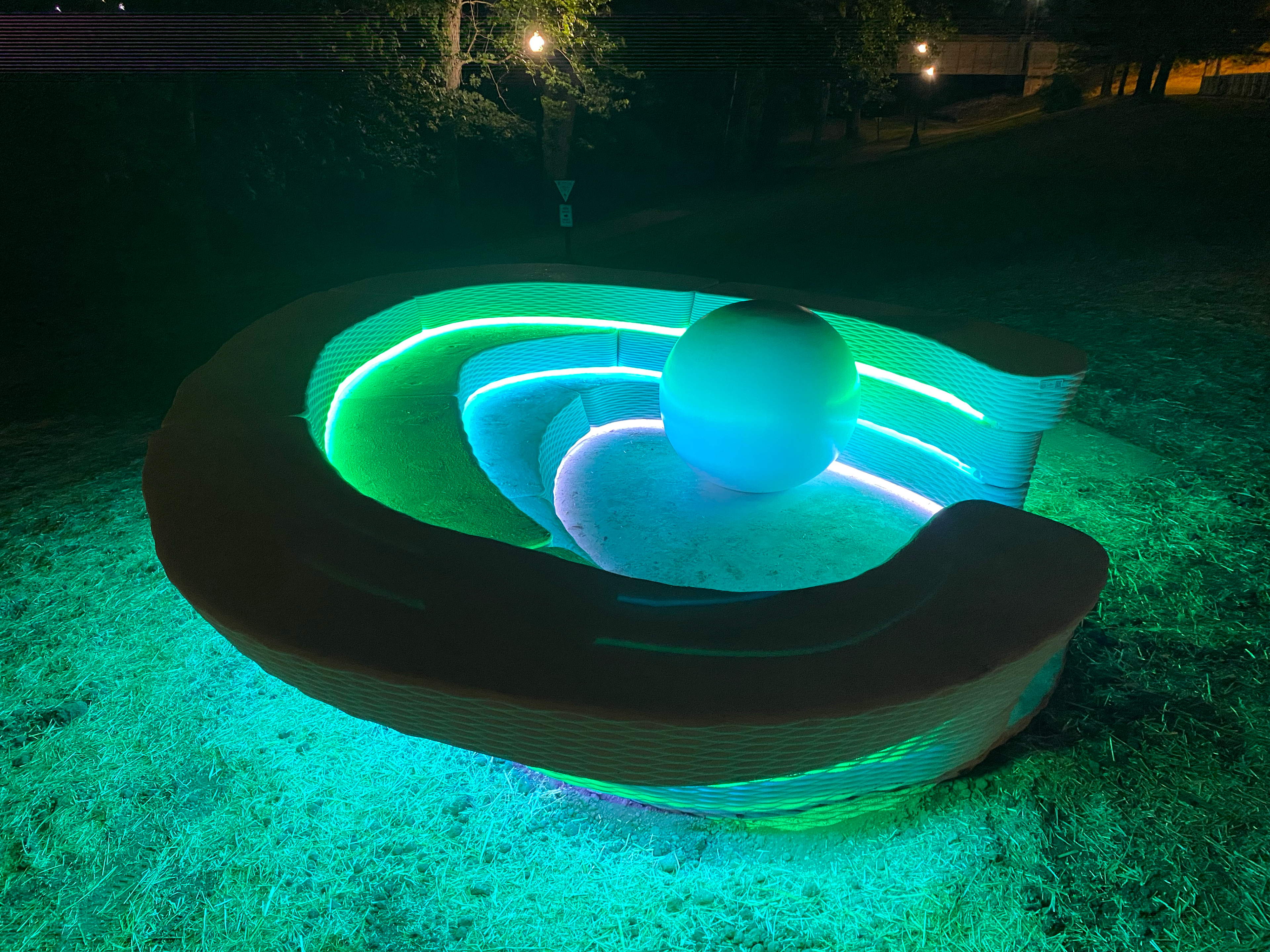 Pearl of the Wabash is a public art sculpture located in Tapawingo Park, created to celebrate and raise awareness about the Wabash River.This project is the result of a three-year collaboration with the City of West Lafayette through a Public Artist in Residence program. Over that time, we engaged the community through public events and surveys to explore what elements were most meaningful to residents. One message came through loud and clear: the Wabash River holds a deep sense of connection and pride for the community.As part of the design process, we partnered with the Wabash River Enhancement Corporation (WREC) and participated in hands-on activities that taught us about the vital role of water quality testing and the many species that contribute to a healthy river ecosystem. We were especially inspired by the Wabash Sampling Blitz, a network of volunteers that has collected water quality data from the river for over 13 years.We chose the freshwater mussel as the sculpture’s symbolic centerpiece. Mussels are natural water filters—absorbing nutrients and helping to purify the water. Sadly, many mussel species native to the Wabash River are now endangered due to pollution, poaching, and their complex and delicate reproductive cycle.The sculpture features three interlocking rings, each representing a point in time from the Wabash Sampling Blitz, beginning in 2012. Through color and form, visitors can discover patterns in temperature, seasonal changes, and other aspects of the river's evolving story. This interpretive color animation displays over 4,500 datapoints.
