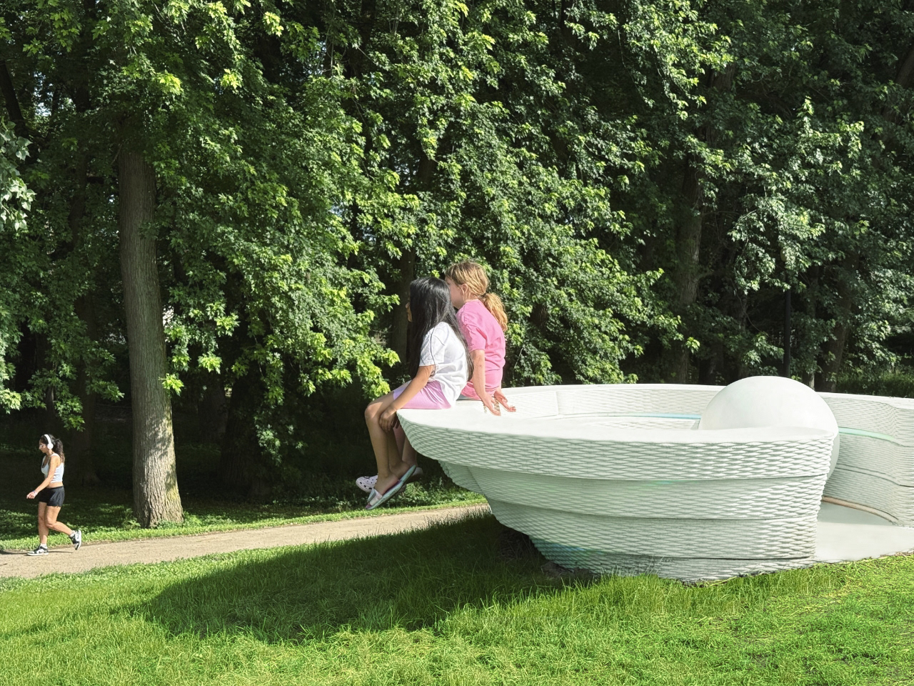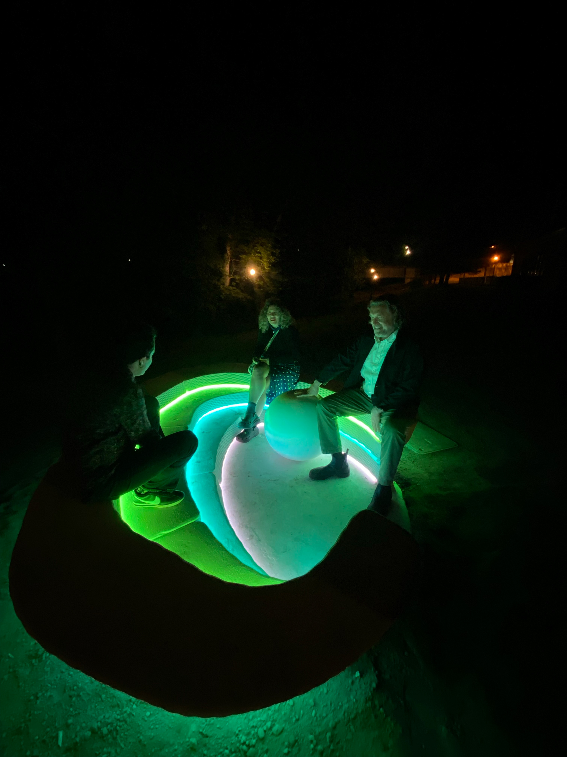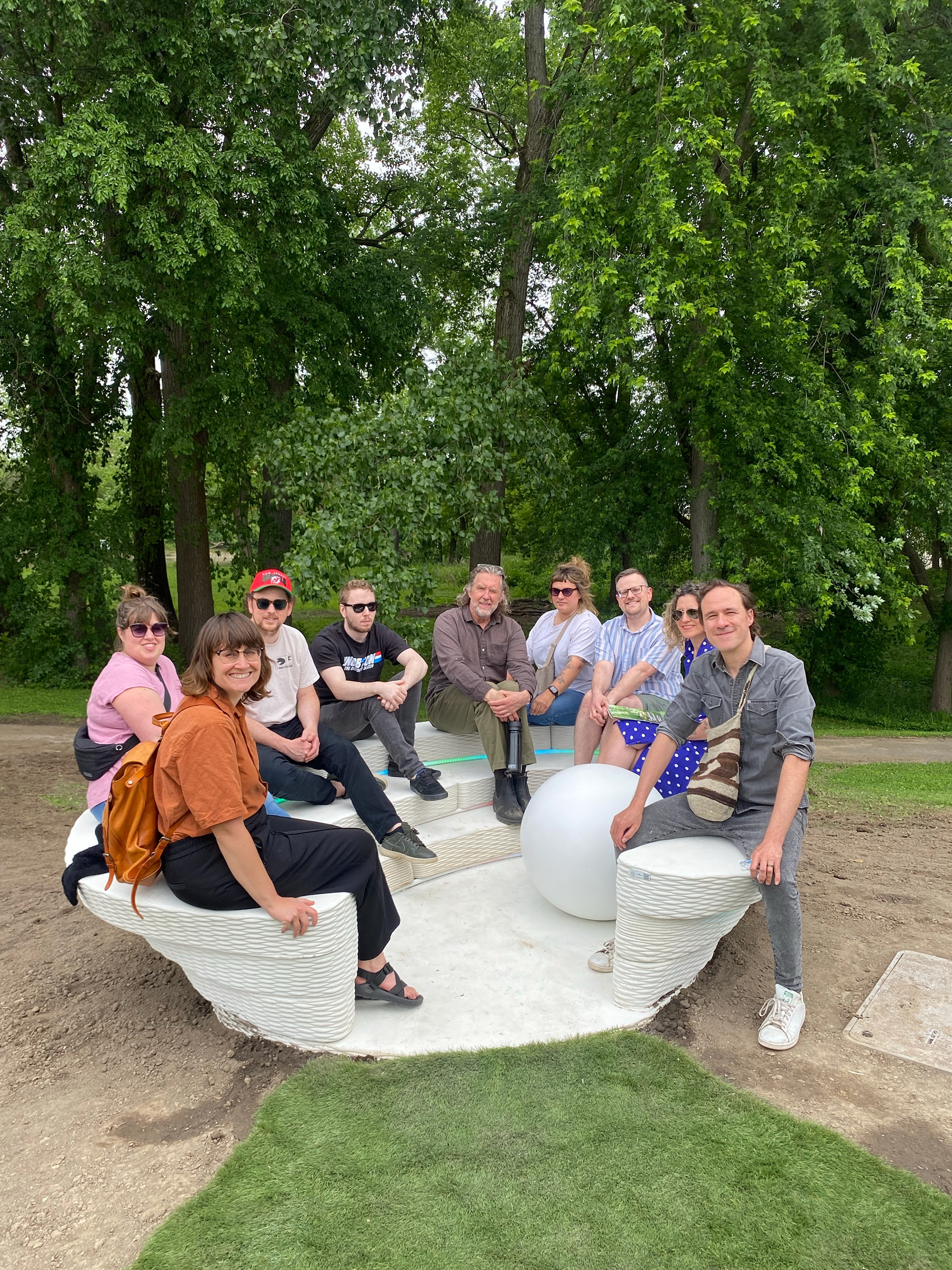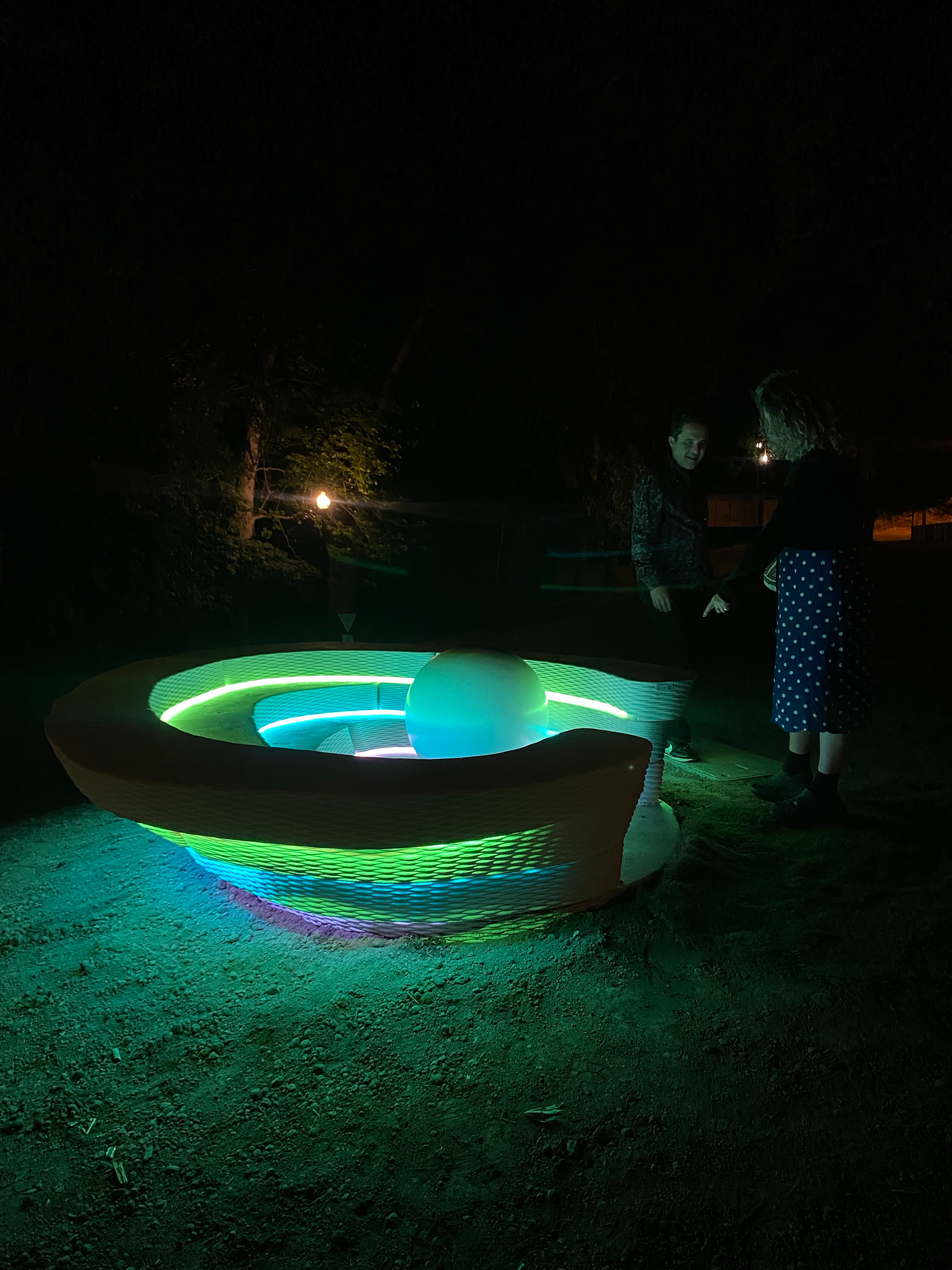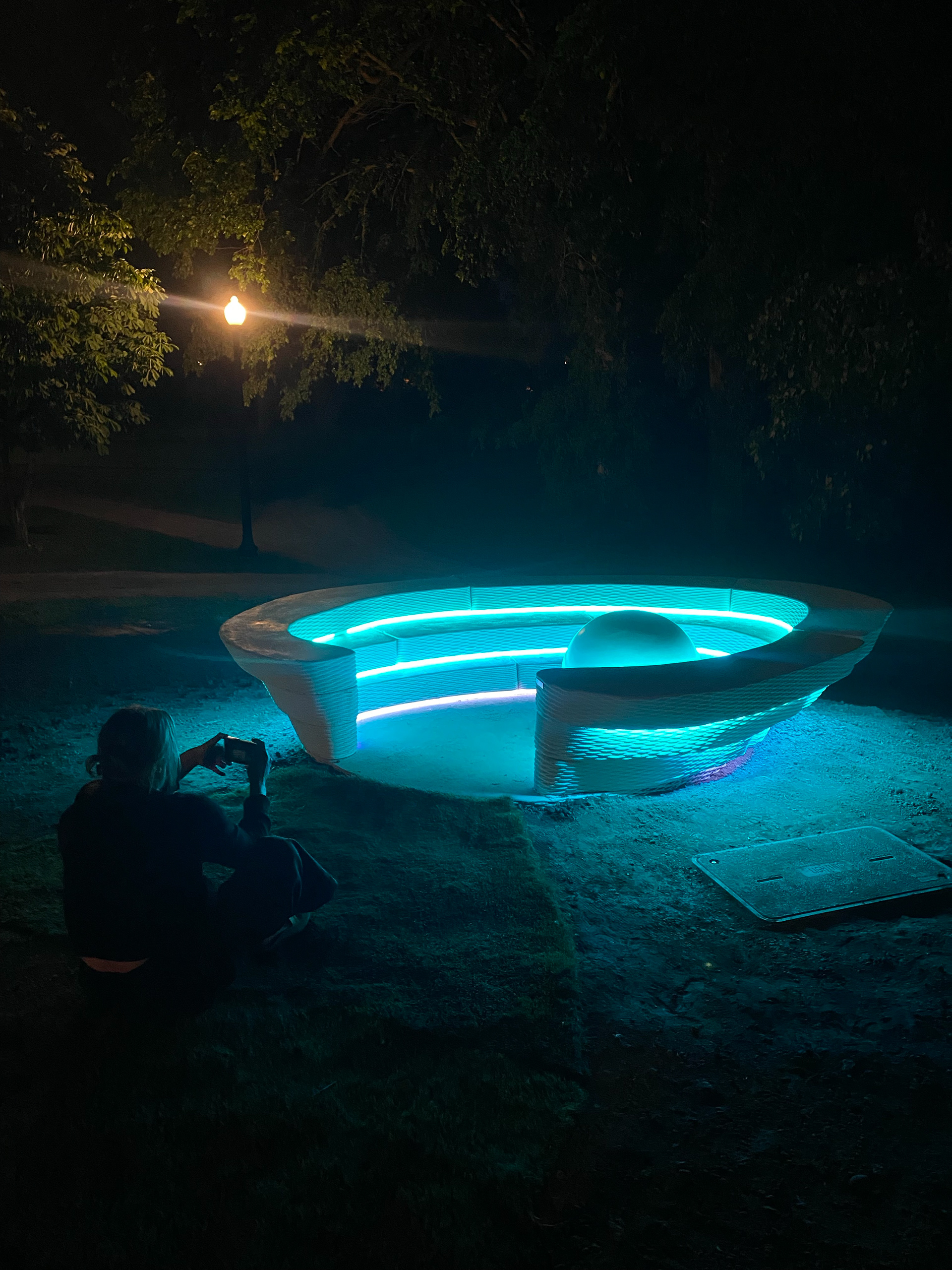 Pearl of the Wabash is a public art sculpture located in Tapawingo Park, created to celebrate and raise awareness about the Wabash River.This project is the result of a three-year collaboration with the City of West Lafayette through a Public Artist in Residence program. Over that time, we engaged the community through public events and surveys to explore what elements were most meaningful to residents. One message came through loud and clear: the Wabash River holds a deep sense of connection and pride for the community.As part of the design process, we partnered with the Wabash River Enhancement Corporation (WREC) and participated in hands-on activities that taught us about the vital role of water quality testing and the many species that contribute to a healthy river ecosystem. We were especially inspired by the Wabash Sampling Blitz, a network of volunteers that has collected water quality data from the river for over 13 years.We chose the freshwater mussel as the sculpture’s symbolic centerpiece. Mussels are natural water filters—absorbing nutrients and helping to purify the water. Sadly, many mussel species native to the Wabash River are now endangered due to pollution, poaching, and their complex and delicate reproductive cycle.The sculpture features three interlocking rings, each representing a point in time from the Wabash Sampling Blitz, beginning in 2012. Through color and form, visitors can discover patterns in temperature, seasonal changes, and other aspects of the river's evolving story. This interpretive color animation displays over 4,500 datapoints.