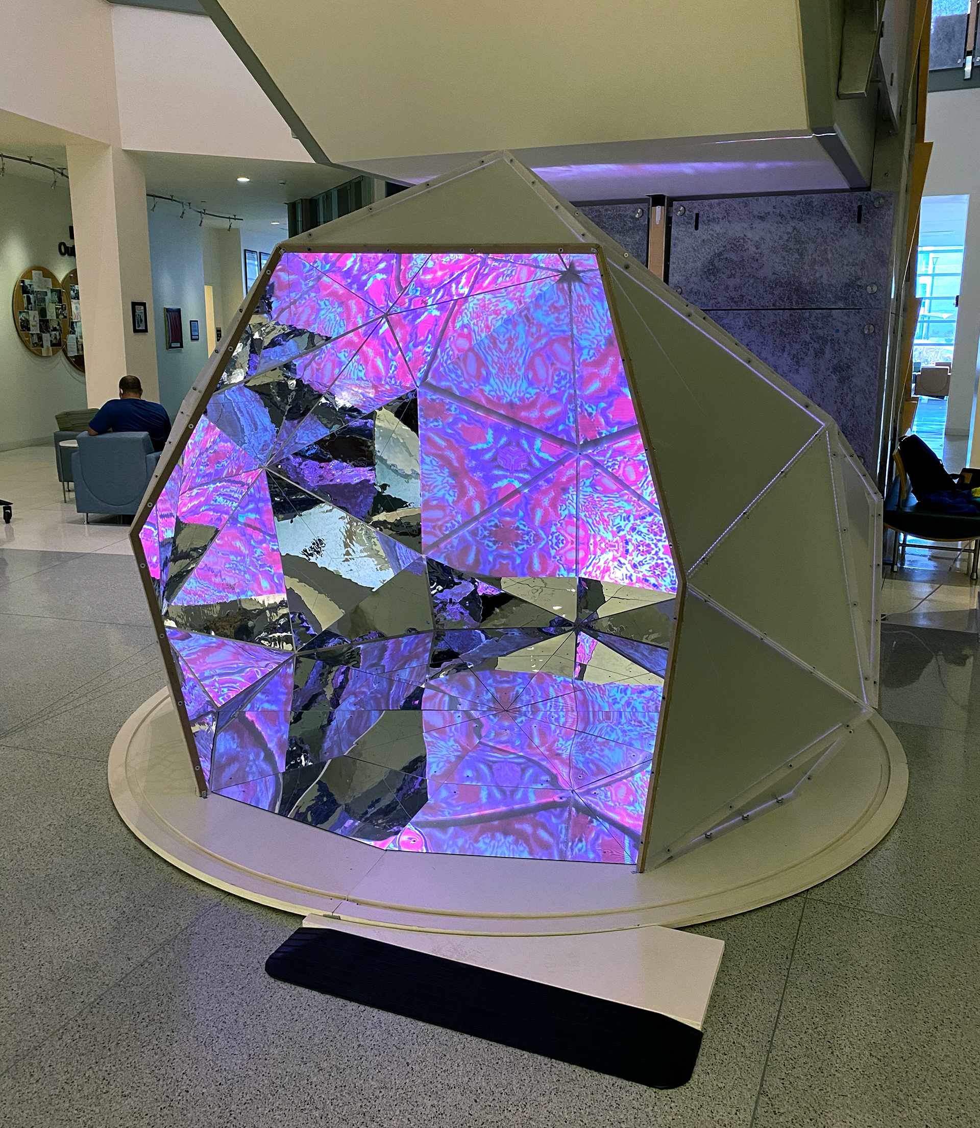 The “Plasmonic Kaleidoscope” is an immersive installation that exhibits the relativity of structural color and reflects the results of groundbreaking research in nanotechnology. In our arts-sci research, we demonstrate that the appearance of the color of an optimized nanosurface (nanotendon) changes depending on variations in the angle and polarization of incident light. The sculpture is an interactive object that allows the general public to experience the relativity of color experienced at the research laboratory. The digital design was fabricated in our Purdue lab and installed permanently on campus. This project was developed in collaboration with Visiting undergraduate scholars from Colombia and working under my mentorship at Purdue University.