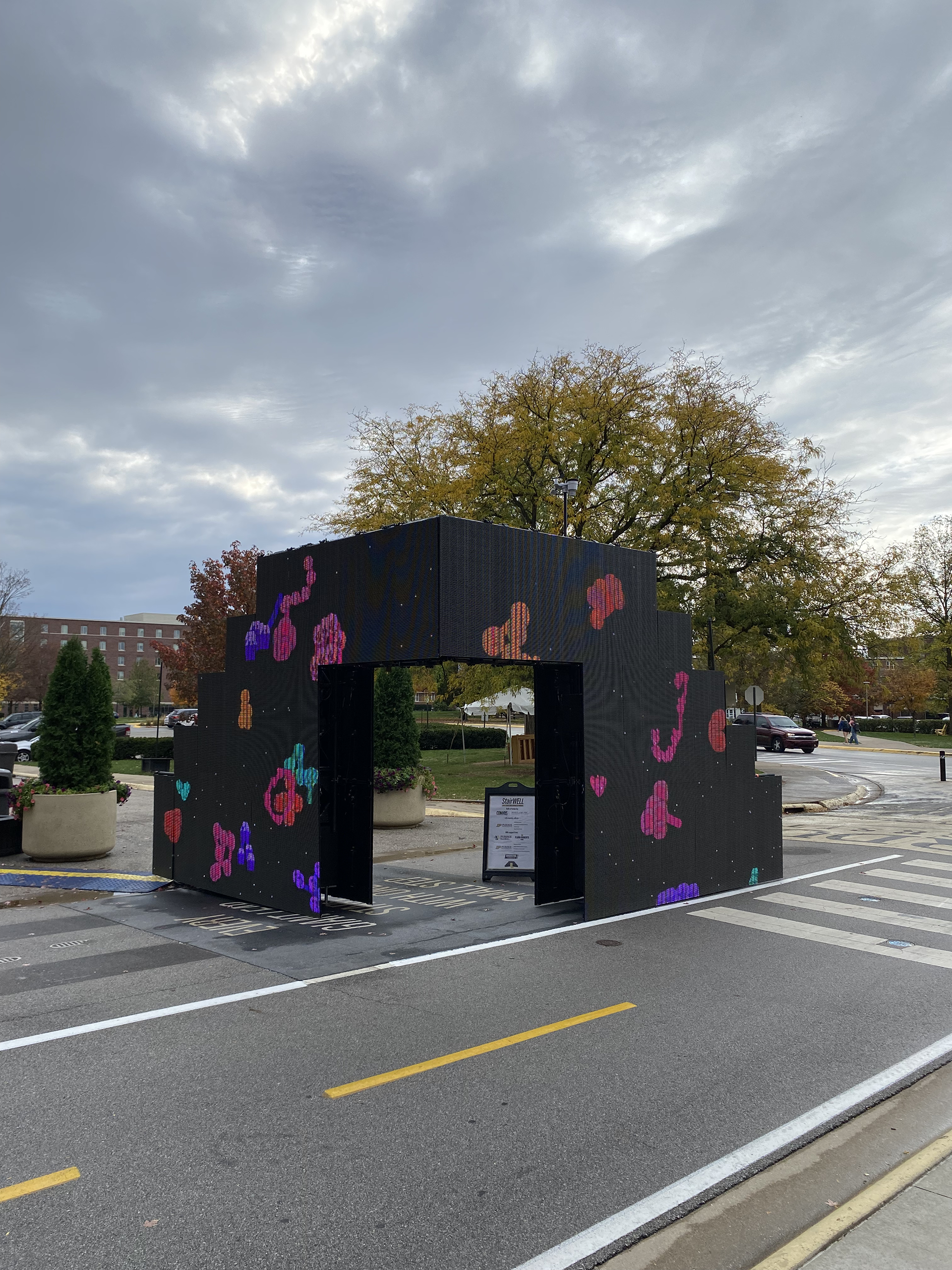 Located at the heart of student life on Third Street, West Lafayette, the StairWELL installation is open to students, faculty, staff, and visitors to click a QR code, answer a series of well-being questions based on the World Health Organization’s WHO-5, and connect with the stair-shaped structure clad in LED panels. This innovative project features a captivating visual display with user-generated avatars, and a responsive soundtrack written by chromic duo. The StairWELL project is a sculpture that focuses on the emotional wellness of students through interactive media. The interactive technology design is broken down into three components: a mobile device interface, a data processing server, and sculpture visualization. The goal of this project was also to show that mobile devices and webapps can be used as an effective participation method for real-time interactive art installations.